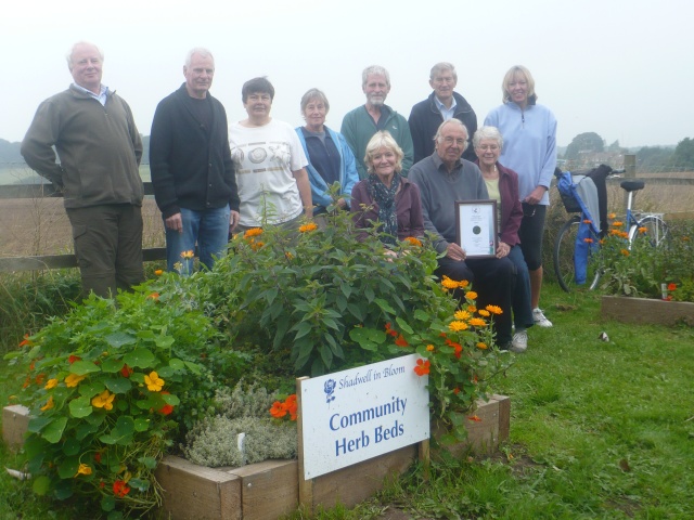 The Community Herb Beds in Colliers Lane were the work of Liz and David Hutton and now developed by Anne and Martin Horne with the help of our Lengthman Peter Hallas and others of SIB. Liz was approached by Shadwell in Bloom for advice on the project. She was both very knowledgeable and keen to be involved. The five raised beds were initially constructed by Martin and Norman and on a wet afternoon a wide range of herbs which Liz had grown or nurtured from seed, were planted. They looked and smelled wonderful!